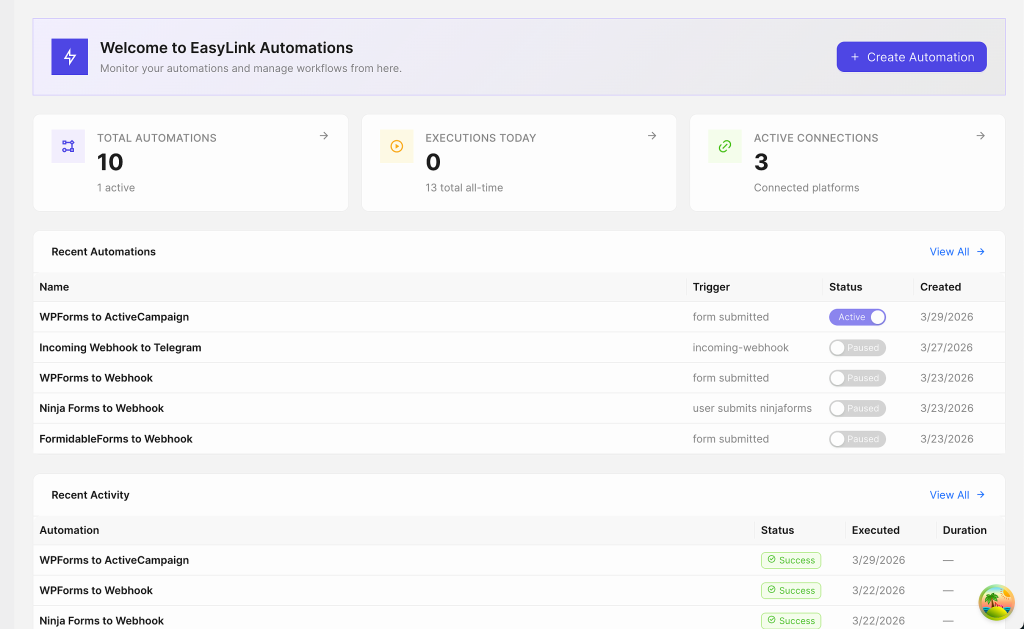 From form submissions to CRM syncing โ EasyLink connects your WordPress site with 120+ platforms. Start free, upgrade when you’re ready.