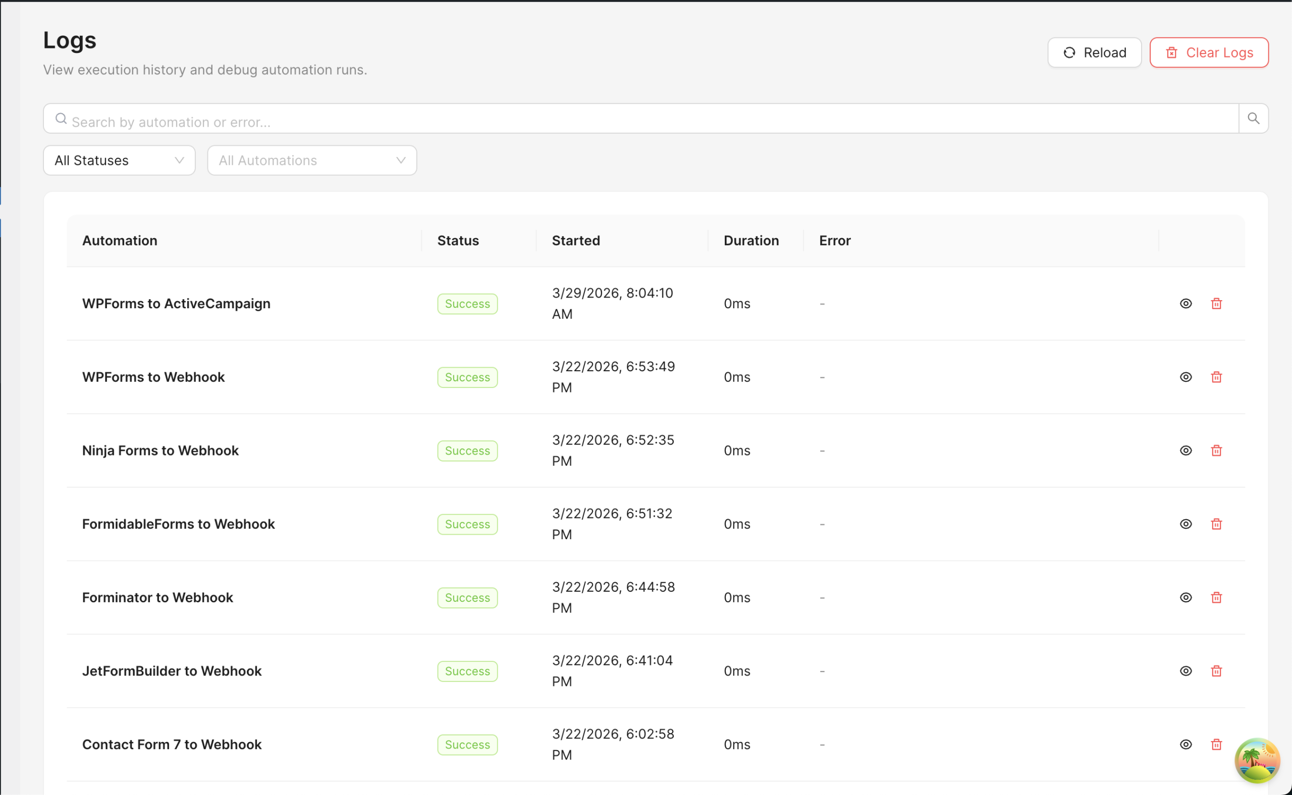 Every workflow run is logged with full execution details. See which automations fired, what data was passed, and where errors occurred. Get email notifications on failures and keep logs clean with configurable auto-cleanup โ so debugging takes seconds, not hours.