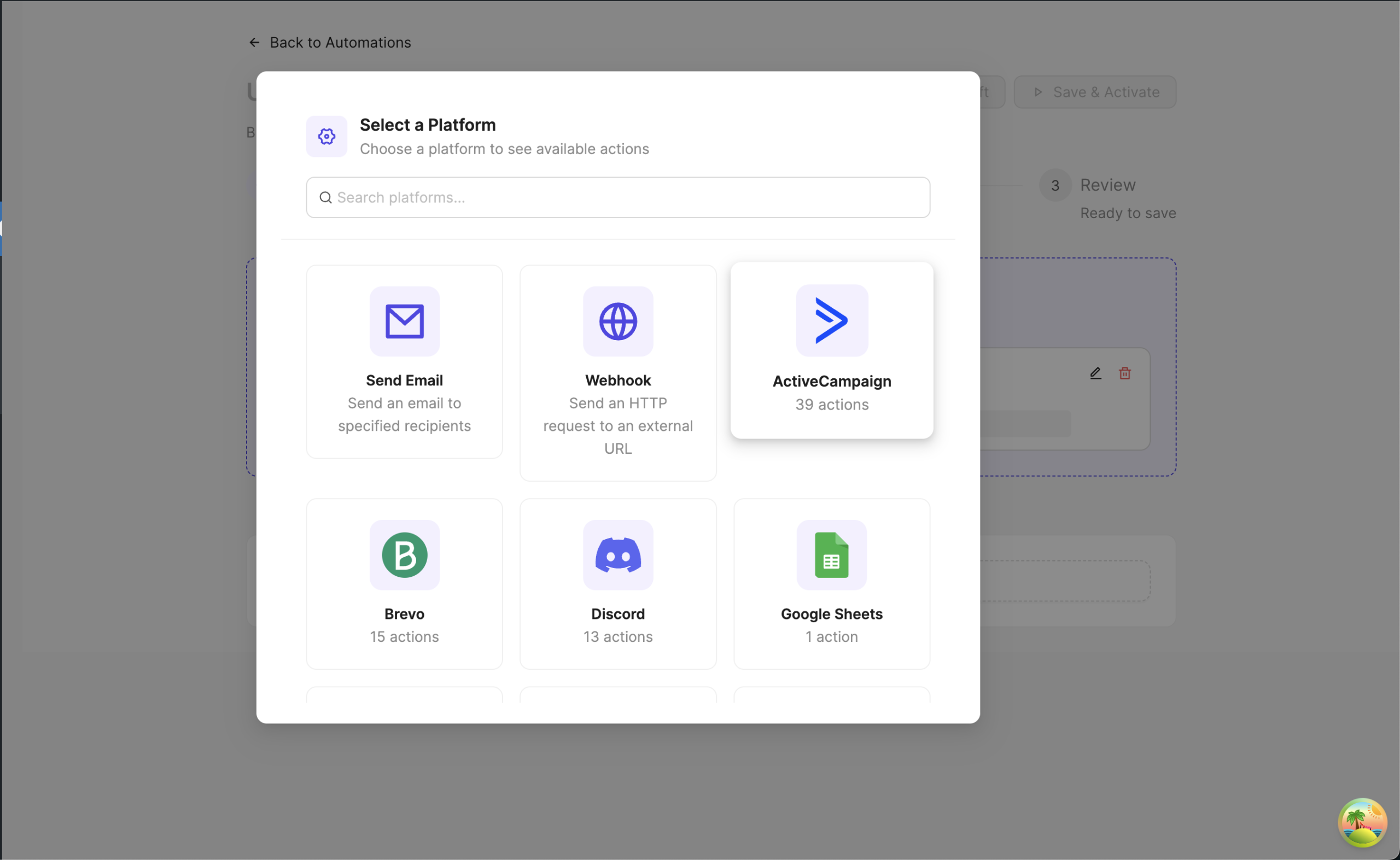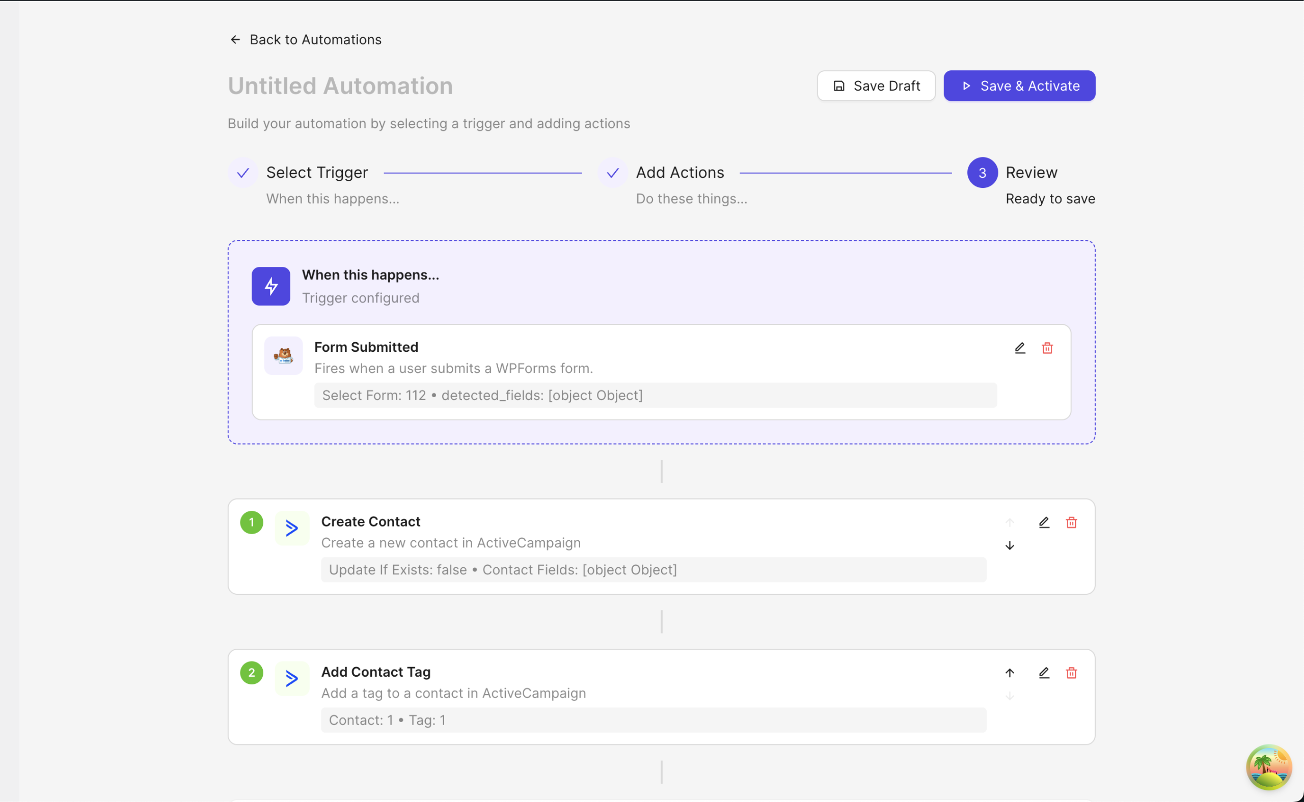 Pick a trigger, add your actions, and activate. Chain multiple actions in sequence, configure field mapping with dynamic placeholders, and review everything before going live โ all without writing code.